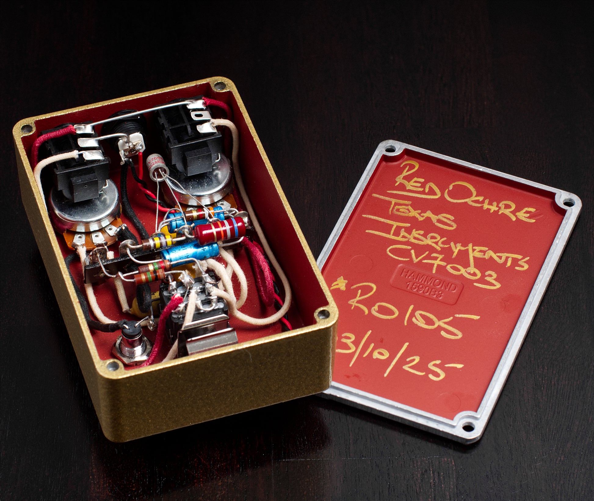 Here you can pre order a The Red Ochre Deluxe. This is our take on the classic Rangemaster Treble Booster with a couple of twists.