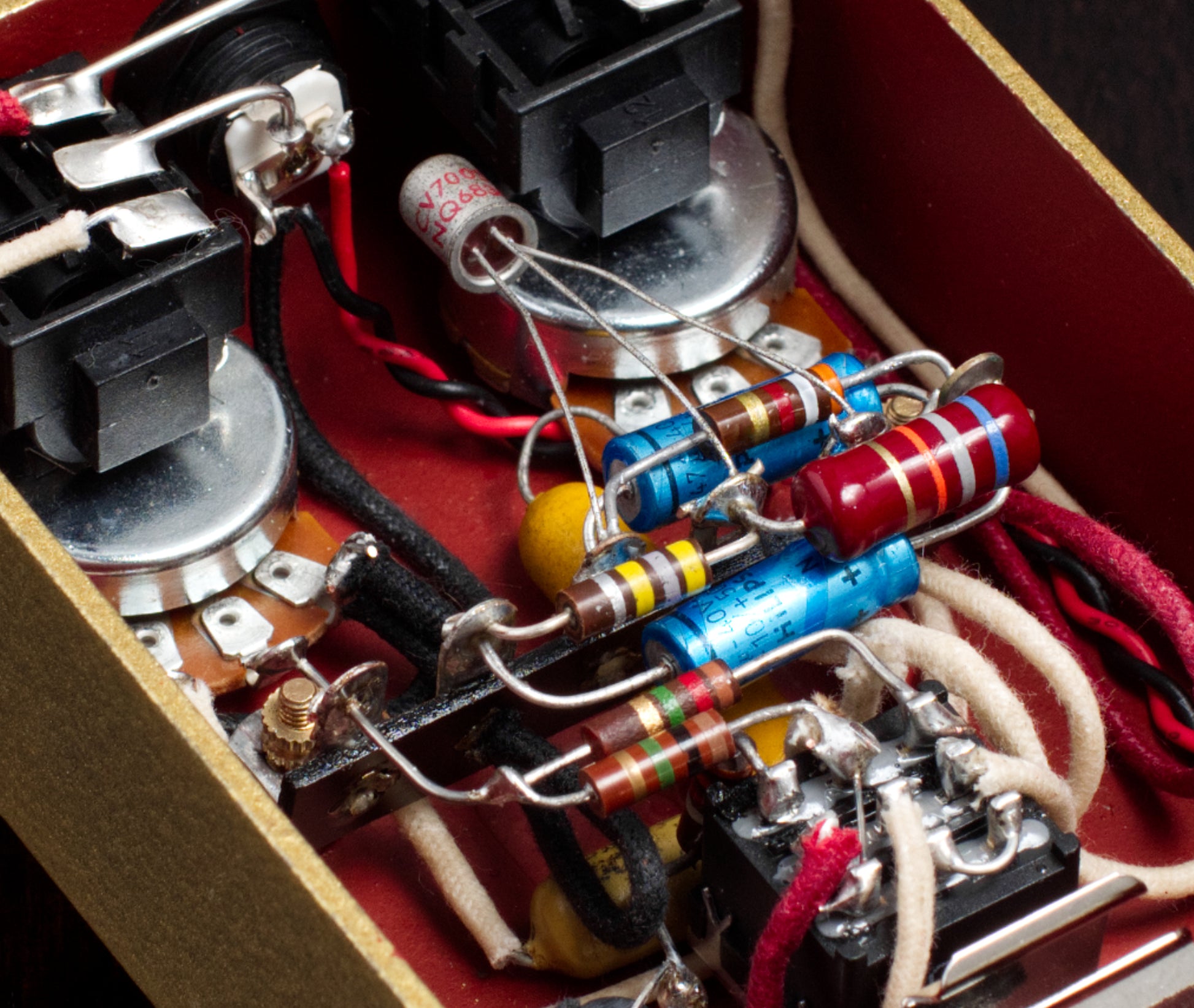 The base model features a Philips AC107 transistor and offers a healthy mid range bump as well as a fair amount of aggression when the guitar is dimed. It cleans up beautifully and is chimey and clear.